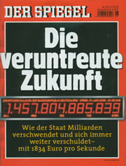 „Sag mal, schreibt der Spiegel neuerdings bei Christian Anders ab?“ fragt mich in den letzten Tagen ein Fan. Ich schaue ihn entgeistert an. „Wie kommst du auf so was? Der Spiegel verteufelt Christian Anders“, entgegne ich. „Ja, kennst du denn den neuen Spiegel nicht“, sagt er. „Die Titelseite sieht fast genauso aus wie die Seite 171 im „Literarischen Rebell“ von Christian Anders. Und die Sache mit den Schulden und den Zinsen habe ich schon im Buch „DER RUB€L MUSS ROLLEN“ gelesen.“ Nun bin ich aber neugierig geworden. Ich sause los und besorge mit den neusten Spiegel, Ausgabe Nr. 26 vom 27.06.05. Und tatsächlich: Die Schuldenuhr auf der Titelseite springt mir fast ins Gesicht. Fakten und Zahlen, Politiker und deren Sprüche, wie bekannt aus den Manuskripten meines Autors: