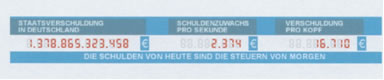von Schwesterwelle bis Schröder und von Wowereit bis Merkel, ES IST ZWECKLOS!!! Alle eure Maßnahmen, die ihr den Deutschen mit wichtig gerunzelter Stirn vorschlagt, SIND ZWECKLOS! Denn was immer ihr auch beschließt, sei es der Hartz IV Wahnsinn oder gar der EIN-EUROJOB (hahaha!), all dies ist auf Deutsch gesagt FÜR DIE KATZ! DENN: Parallel zu euren unsinnigen Maßnahmen läuft die SCHULDENUHR ununterbrochen!!! Ja, sie läuft ununterbrochen und exponentiell steigend. Irgendwann wird und muss das ganze Lügengebäude „Agenda 2010“ zusammenbrechen! Weil ihr nämlich nicht in der Lage sein werdet, die SCHULDEN + ZINS + ZINSESZINS zu bezahlen. Staatsverschuldung: 1,4 Billionen Euro. Zinsen zu zahlen JEDEN TAG 120 Millionen Euro!“