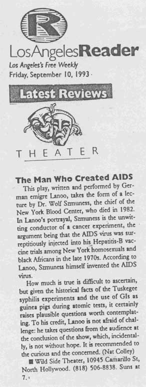 This play, written and performed by German émigré Lanoo, takes the form of a lecture by Dr. Wolf Szmuness, chief of the New York Blood Center, who died in 1982. In Lanoo’s portrayal, Szmuness is the unwitting conductor of a cancer experiment, the argument being that the AIDS virus was surreptitiously injected into his Hepatitis-B vaccine trials among New York homosexuals and black Africans in the late 1970s. According to Lanoo, Szmuness himself invented the AIDS virus.