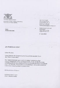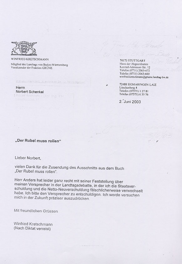 Am 2. Juni erreichte uns über Herrn Norbert Schenkel, der das Vorwort zum Buch geschrieben hatte, folgende Antwort des Fraktionsvorsitzenden Kretschmann: