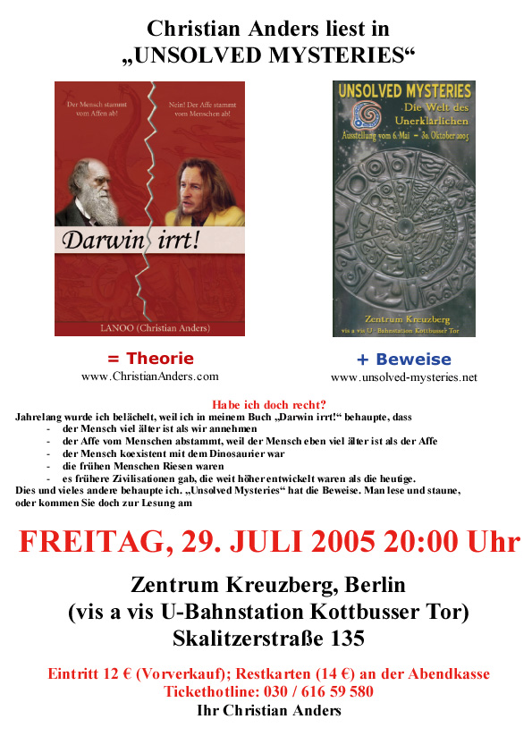 Dies und vieles andere mehr behaupte ich. Nun gibt es eine Ausstellung in Berlin „Unsolved mysteries“, die all diese Thesen zu bestätigen scheint. Man lese und staune, oder noch besser – man gehe selbst dorthin. Ich werde es auf jeden Fall tun – und zwar am 29. Juli 2005 (für mehr Infos bitte hier klicken) – denn die Exponate der Ausstellung sind Ergänzung und Beweis für mein Buch DARWIN IRRT!