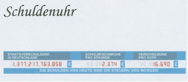 von Schwesterwelle bis Schröder und von Wowereit bis Merkel, ES IST ZWECKLOS!!! Alle eure Maßnahmen, die ihr den Deutschen mit wichtig gerunzelter Stirn vorschlagt, SIND ZWECKLOS! Denn was immer ihr auch beschließt, sei es der Hartz IV Wahnsinn oder gar der EIN-EUROJOB (hahaha!), all dies ist auf Deutsch gesagt FÜR DIE KATZ! DENN: Parallel zu euren unsinnigen Maßnahmen läuft die SCHULDENUHR ununterbrochen!!! Ja, sie läuft ununterbrochen und exponentiell steigend. Irgendwann wird und muss das ganze Lügengebäude „Agenda 2010“ zusammenbrechen! Weil ihr nämlich nicht in der Lage sein werdet, die SCHULDEN + ZINS + ZINSESZINS zu bezahlen. Staatsverschuldung: 1,4 Billionen Euro. Zinsen zu zahlen JEDEN TAG 120 Millionen Euro!“